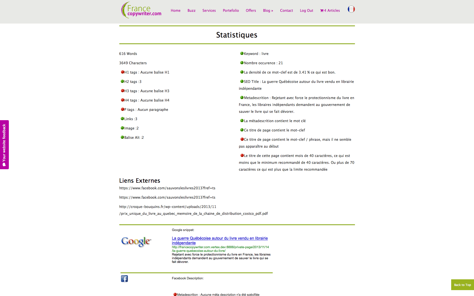 L’outil de statistiques SEO est un atout important pour nos rédacteurs web : il donne de nombreuses indications pour aider à mieux rédiger de manière naturelle tout en appliquant méthodiquement le SEO. La rédaction web est plus pertinente.