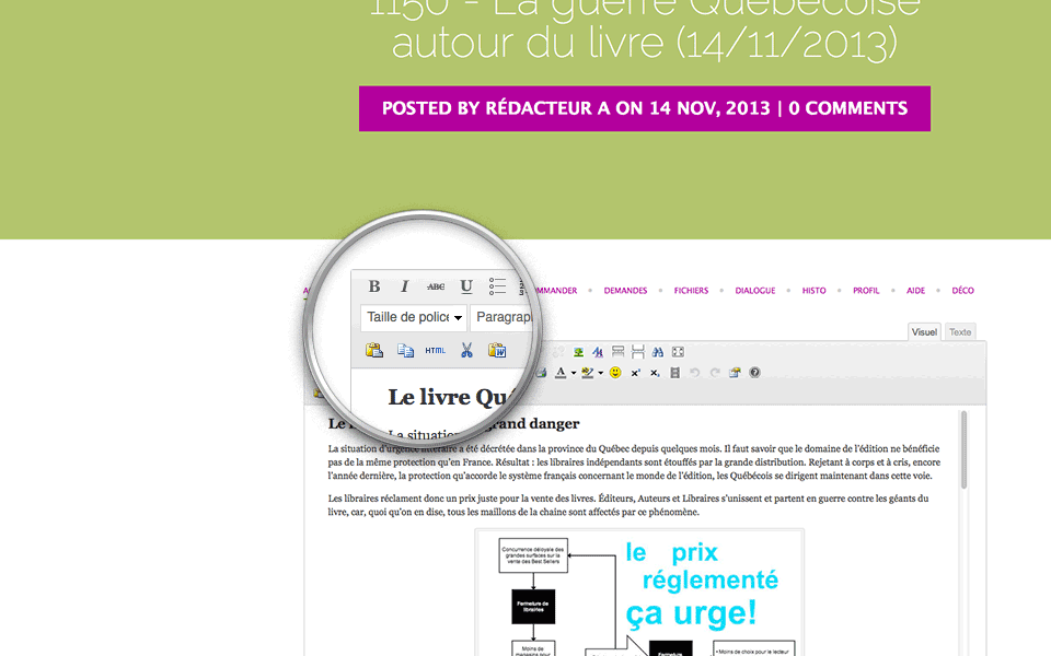 Nous avons choisi de développer, en interne, un outil qui permet de faciliter l’échange de données, d’informations et de fichiers : l’éditeur. Améliorer régulièrement, l’éditeur est un moyen efficace, pour nos rédacteurs web, de garder le contact avec les clients, de déposer des textes et surtout de voir et comprendre les statistiques de référencement.